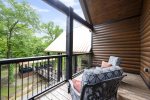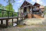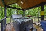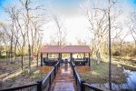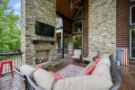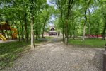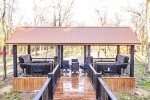 At one point you will want to step away from the boundless amenities of the game room and soak up the fresh air. This cabin extends its generous dimensions by making the outdoors part of the living environment. The vaulted outdoor lounge is an easy extension of the living room, mirroring the layout by providing a comfortable sectional sofa as well as padded chairs all nestled around the inviting warmth of a floor-to-ceiling stonework gas log fireplace. While enjoying everyone's company, you can whip up signature barbeque favorites in the built-in BBQ featured in the outdoor kitchen area. While you wait for the flavors to seal, you can strike up a game on the air hockey table or play some horseshoes. Steps away, a bridge connects this outdoor lounge space with a gazebo complete with two hot tubs and sitting area. Two fire pits provide that cozy rustic ambiance near the creek when you want to wander away from the shelter of the deck areas. For the youngest members of your group, there's no place like the gaga ball pit or outdoor play set featuring a wall climb, trapeze bar, swings, slides, and clubhouse.