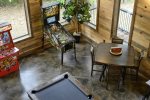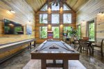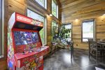 Downstairs: King Bedroom with trundle bed and ensuite bathroom, King Bedroom w/ensuite bathroom and copper tub, King Bedroom w/ensuite bathroom, Game Room w/pool table, Shuffle Board, Video Arcade, Pinball Machine, Wet Bar with refrigerator, Poker/Game Table, Movie Theatre Chairs, Big Screen TV