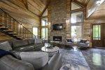 Pure privacy, casual grandeur and custom touches await behind the stately walls of this one-of-a-kind residence. Leaded glass double entry doors welcome you inside, revealing the WOW factor in so many ways, including a timeless design that offers you a bright, versatile floor plan with plenty of space to stretch out and entertain! This divine cabin makes an immediate impact with stunning modern details seamlessly combined with classic rustic charm. Soaring vaulted ceilings crown the layout, exquisitely boasting floor-to-ceiling windows that effortlessly serve to spread light throughout to increase the home's brightness and sense of openness. Relaxed living and gracious entertaining comes naturally in the impressive open concept living room embraced by the beauty of the dramatic stonework gas log fireplace and ample seating arrangement. From here, the custom kitchen becomes a gourmet showplace with premium stainless appliance and granite prep island. These spaces float over to the formal dining area with ample seating for all including two benches, upholstered seats, and high back chairs.