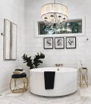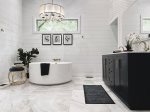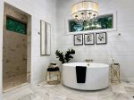From the gold fixtures, high-end Kitchen-Aid appliances, custom open cabinets, and waterfall edge countertops made from the latest state-of-the-art materials, the galley kitchen is also reminiscent of 1930s glam styling. Within the well-appointed kitchen, you will find all the small appliances, utensils, and serving dishes needed to prepare a gourmet meal or a simple late-night snack. Sit at the island on the polished gold bar stools and enjoy your morning coffee while your loving chef makes you a delicious breakfast (or vice versa).