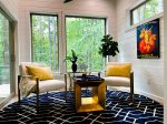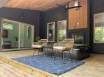 Hollywood Regency was custom designed by a well-renowned Dallas architect to take advantage of the surrounding landscape to provide our guests with a unique experience that encompasses both the indoors and outdoors simultaneously. As soon as you enter, the soaring ceilings painted a high gloss black give you the feeling of space and the idea that this is not your ordinary cabin. The extensive use of windows and sliding glass doors not only brings the outdoors in but frames the trees to create an almost gallery-like feel inside the cabin and ever-changing art on the walls. The see-through fireplace in the living room brings in even more light and more openness into the space to allow you to relax and enjoy your much-needed time away.