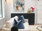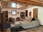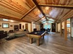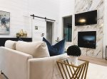The living space is a luxurious open-concept design that affords comfortable and easy living during your stay at Hollywood Regency. All the furniture is high-end and comfortable. From the sofa, you can enjoy watching the 55” smart TV and take in the warm, soft, orange glow of the see-through gas log fireplace, all while sipping the cold Manhattan you made on the rolling bar cart just steps away. If your mood changes, bring your drinks and move to the game room retreat, a unique room in this cabin where you can sit in the cushy club chairs and play games, kick back, or talk about the day’s events.