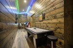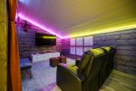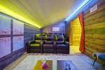 Directly connected to the bunkroom is a hidden staircase that leads to a second-floor retreat designed for all ages! As you ascend the stairs, your eyes are met with a ceiling decked out in brilliant LED lighting. As you enter, you see a row of colorful video arcade game machines that will keep everyone entertained for hours. If it's time for a movie, step through the arcade room into your very own theater, complete with 7 electric media recliners and a huge flat screen tv. Who said roughing it really has to mean roughing it!