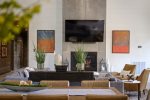 Outside: Outdoor fireplace (seasonal October 1-March 31), 3 outdoor living spaces, and 2 dining areas, outdoor dining table, outdoor grill, outdoor bar with stool seating, large fire pit with chairs, corn hole, connect four