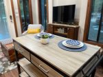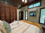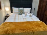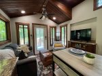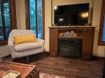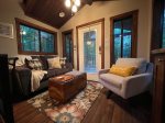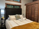 Just down the hallway is the intimate bedroom retreat that shares the cozy ambiance of the living room complete with another HD Smart TV. Ambient lighting, plenty of storage, and a plush queen-sized bed with a pillow-top mattress and soft 100% cotton linens make this bedroom a true treat that simply must be experienced in combination with the quiet peacefulness of nature. A sliding pocket door opens to reveal the amenities of the full bathroom, complete with a tiled walk-in shower, porcelain sink, and plenty of storage space for all your essentials.