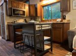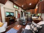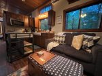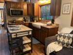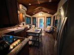 Upon entering, you will find an inviting, "snug" living room complete with a 50" HD flat-screen smart television, a two-person cushy sofa, a reading chair, and an easy-to-start electric fireplace that adds warmth to the space on chilly nights. The full-height vaulted ceilings make the space open up and not feel claustrophobic like most tiny houses tend to do. The layout inside Snuggle Up reveals a contemporary open-concept floor plan, ensuring everything you could possibly need is within easy reach for interactive living and relaxation. The efficient galley kitchen is fully appointed with an electric cooktop, a microwave oven that doubles as a conventional and convection oven, a free sitting island that doubles as a casual dining table or prep space, an automatic dishwasher for easy cleanup, and every other necessity you could need to offer the convenience of home. Whether you are an avid foodie who loves to flex your culinary prowess or a microwave-and-go connoisseur, this kitchen is sure to please!
