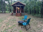 Cute and Cozy, Snuggle Up brings style and comfort to the TINY HOUSE arena in a chic and bohemian style aesthetic. Snuggle Up is located within the Sweet Serenity Resort, a new 36-acre subdivision surrounded by acres and acres of hardwood trees, majestic pines, and farmland, 15 minutes north of Hochatown. Come sit on one of the two porches, kick back, and enjoy the unique surroundings and the peaceful seclusion this unique property has to offer.