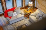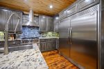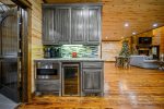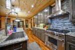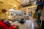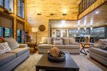 Exemplifying refined grandeur, the home is introduced by paved circular driveways; a postcard-perfect covered front porch; and dramatic double doors. The interior is a testament to elegant living, featuring a grand living room with a spectacular fireplace, gourmet kitchen and magnificent outdoor spaces in tune with the serenity of nature. The layout is thoughtfully designed for spacious comfort and shows off bountiful nature panoramas. Soaring ceilings and wall of windows work in tandem to illuminate a soothing rustic-modern decor, while evoking your circadian rhythm with soft natural light. Anchored by a two-story stone fireplace, the living room yields comfortable couch seating with flat screen TV, overlooked by the loft above. From here, you can move freely into the dining area with live edge wood dining table and fully equipped kitchen with everything the eager cook could ever wish for including high end stainless steel appliances like a gas range, beverage chiller, and warming drawer. Sweeping granite countertops and a center island are all yours to enjoy along with gorgeous cabinets and fully stocked cabinets housing necessary crockery, cooking utensils, various pots and pans, dishcloths, coffee maker, and more. This well-planned layout is further outfitted with full size washer and dryer in the laundry room and half bath located off the entry.