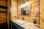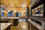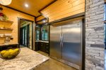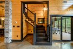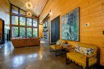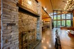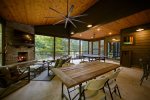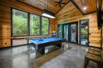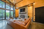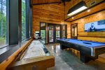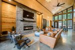 Designed with the highest end finishes, the property combines sleek clean lines of contemporary design with the cozy rustic aesthetic. Just across the threshold, gracious living and dining areas merge out to the property's outdoors to create the ultimate private entertainment venue. The grand kitchen is a maestro for gourmet cooking and dining with premium stainless steel appliances including gas stove and built-in oven. Custom cabinets wrap the room in modern splendor alongside a large island with apron front sink and chic pendant lighting. The laundry room houses a secondary fridge for overflow, as well as pantry shelving for added storage. High vaulted ceilings punctuated by tall windows ensure there is no shortage of daylight in the open great room, enhanced by concrete flooring and warm wood walls, illuminated by designer lighting. The formal dining room is well accommodating for up to twelve guests. Nearby, the sophisticated living room is a relaxed destination with large sectional couch facing an elegant stacked stone fireplace and flat screen TV. Sliding glass doors off of the living room lead to the game room complete with pool table, shuffleboard, and Golden Tree video arcade game to suit various entertainment interests.