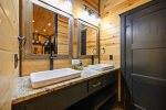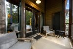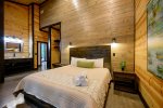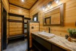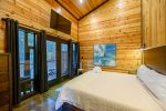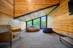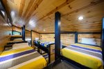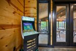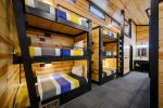 The five bedroom floor plan includes spa-like ensuite bathrooms, luxuriously outfitted with a rain shower and soaking tub, while each suite maintains even more privacy with dedicated screened patios. The main bedroom even boasts private access to the hot tub deck. Large crowd? No problem with a bunk room outfitted with thirteen twin beds, with further amenities that include a retro video arcade, comfortable seating, and ensuite bathroom with double sinks. A cozy nook room provides a quiet place to watch TV, take in the views from the large upstairs window, or other activity with various seating including bean bag chairs.